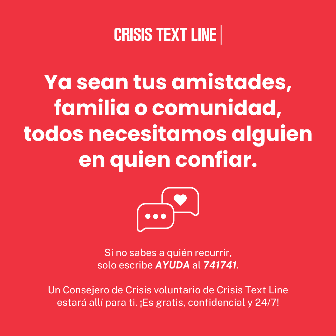 Crisis Text Line está aquí para ayudar a los estudiantes, padres, y educadores a enfrentar el estrés del año escolar. Corre la voz acerca de este servicio en tu escuela visitando crisistextline.org/school