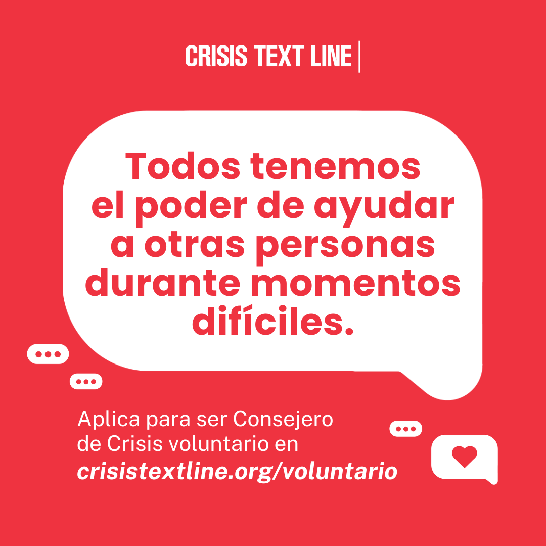 ¿Quiénes son los Consejeros de Crisis? Son voluntarios capacitados que, con el apoyo del personal de tiempo completo de Crisis Text Line, utilizan la escucha activa, la resolución colaborativa de problemas y la planificación de seguridad para ayudar a los texters en sus momentos de crisis.