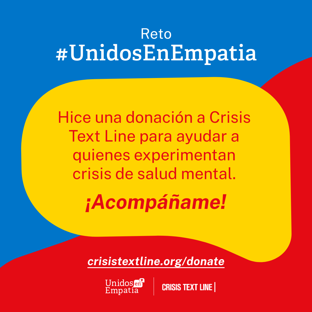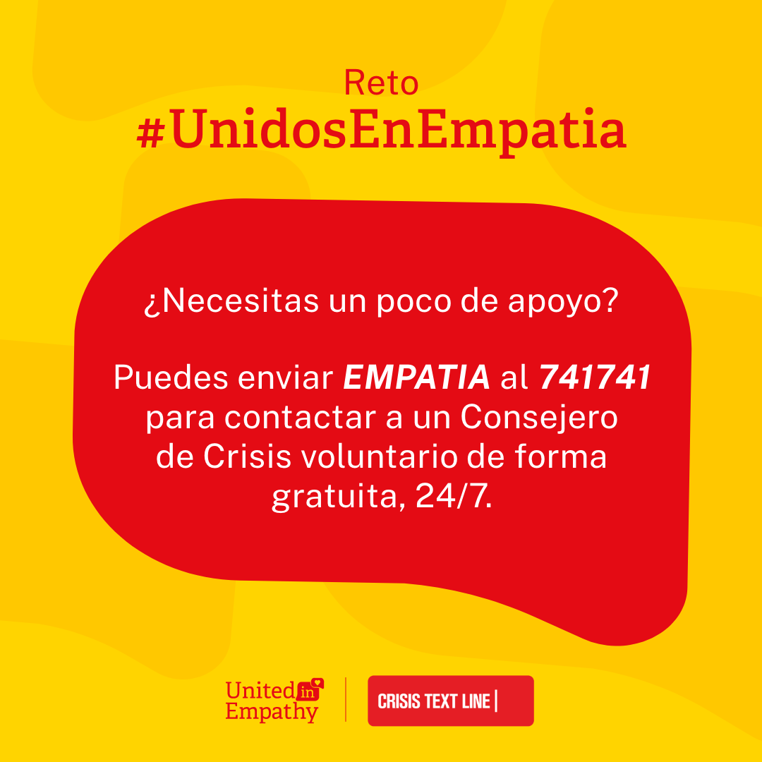 Hay una crisis de salud mental en Estados Unidos, pero no estás solo. Estoy participando en el reto #UnidosEnEmpatia de @crisistextline porque tienen voluntarios para ayudarte las 24 horas del día, 7 días a la semana. Comparte este recurso digital para el #mentalhealthawarenessmonth para asegurarte de que todos puedan tener acceso al apoyo que necesitan. Etiqueta a tus amistades para que puedan tener en quien confiar durante momentos difíciles.