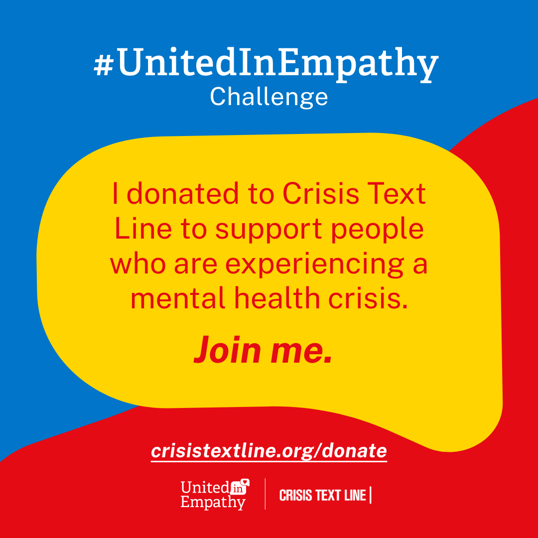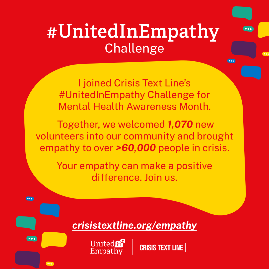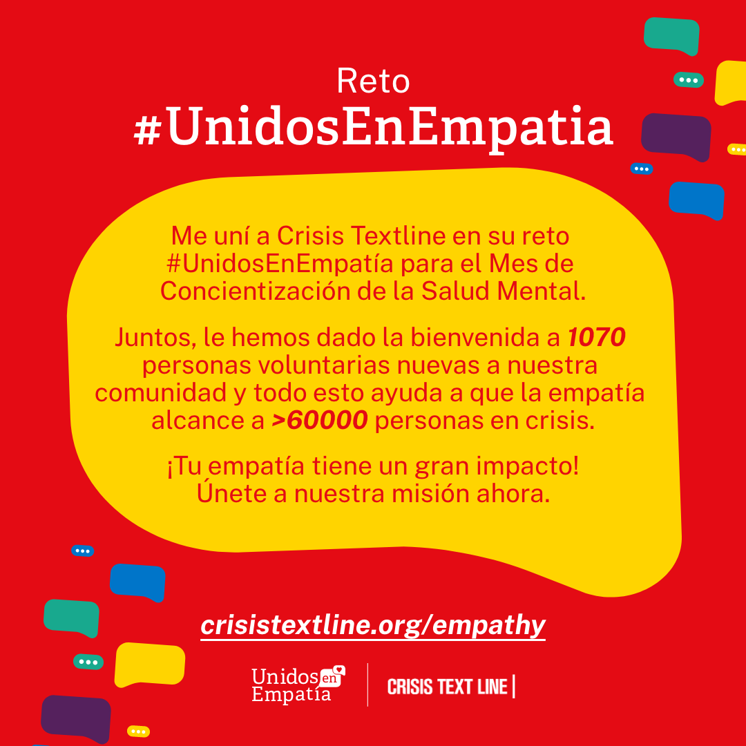 Mayo es el mes de la #SaludMental y me he unido a @crisistextline en su reto #UnidosEnEmpatia. Este mes, nuestra comunidad siembra y esparce empatía al invitar a 1070 personas a convertirse en voluntarios. La crisis de salud mental no se limita solamente a mayo: hay mucho trabajo por hacer. Únetenos y seamos parte de la solución. Hoy y cada día, nos une la empatía.